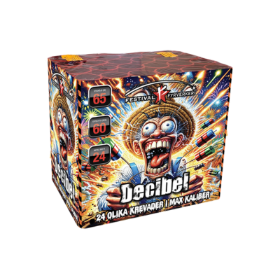 Decibel är en bombtårta med hög effekt och kraftfulla brott i upp till 50 mm kaliber. Showen består av 24 skott som når upp till 65 meters höjd och varar i cirka 60 sekunder. Effekterna är stora, ljusstarka och tydliga, med en markerad final som avrundar helheten.
